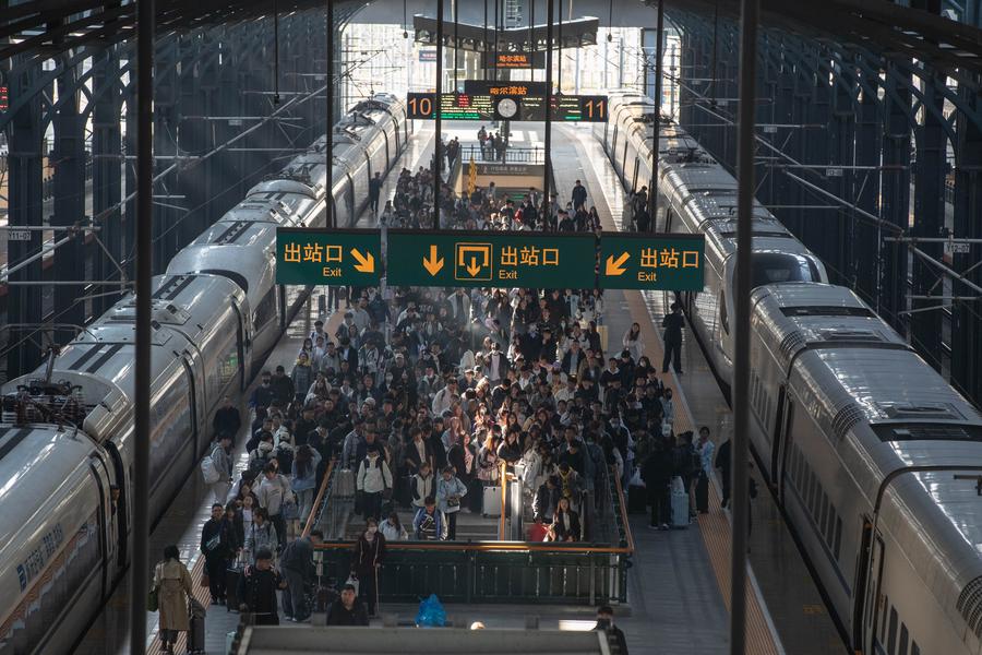Passengers are pictured on the platform of Harbin Railway Station in Harbin, northeast China's Heilongjiang Province, Oct. 7, 2024. (Xinhua/Zhang Tao)