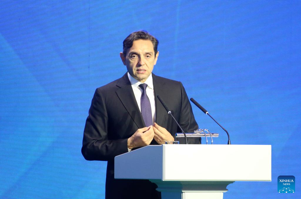 Serbian Deputy Prime Minister Aleksandar Vulin delivers a speech during the Second Minsk International Conference on Eurasian Security in Minsk, Belarus, Oct. 31, 2024. The Second Minsk International Conference on Eurasian Security kicked off on Thursday, with the aim to conduct frank and inclusive discussions on such topics as the multi-polarization of the world, security on the Eurasian continent, and global economic security. (Photo by Henadz Zhinkov/Xinhua)