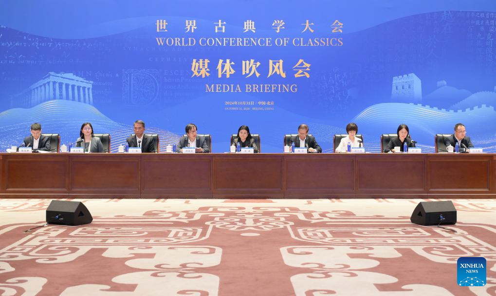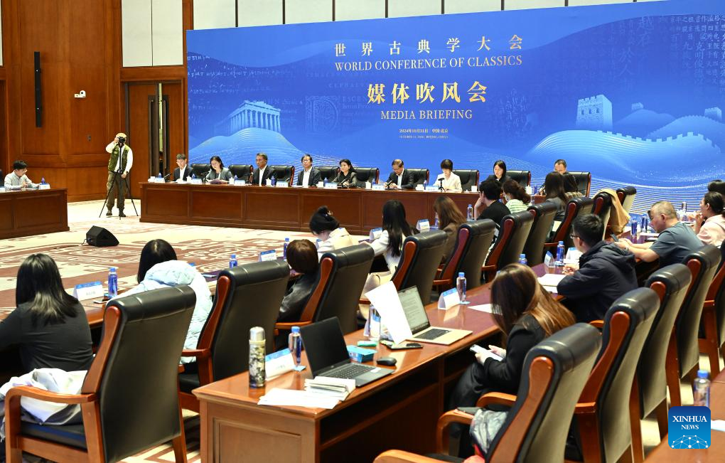 This picture taken on Oct. 31, 2024 shows the media briefing of the inaugural World Conference on Classics in Beijing, capital of China. This conference slated for Nov. 6-8 in Beijing will welcome participants from across the globe to engage in in-depth discussions on topics related to classical civilizations. (Xinhua/Li He)