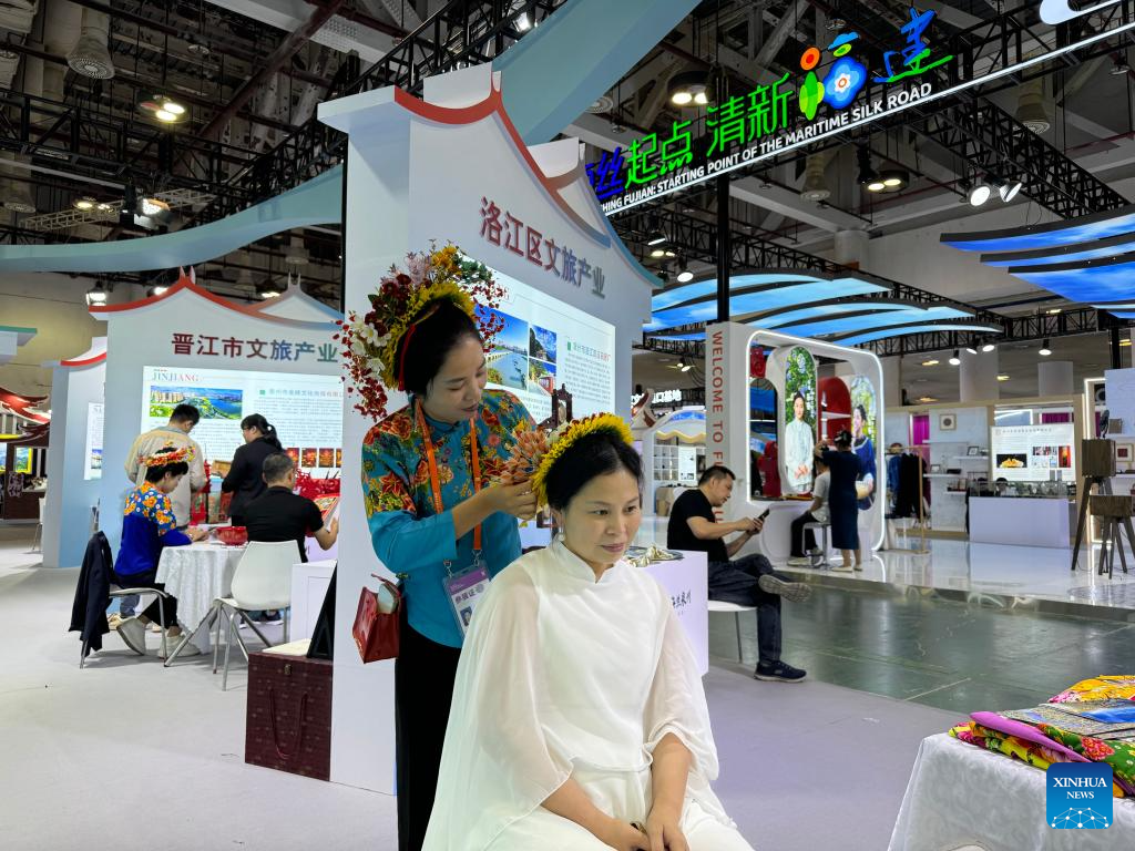 A merchant tries a flowery headwear during the 15th Cross-Strait (Xiamen) Cultural Industries Fair in Xiamen, southeast China's Fujian Province, Oct. 31, 2024. The fair running from Oct. 31 to Nov. 3 kicked off in Xiamen on Thursday. (Xinhua/Yan Zhihong)
