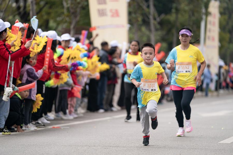 A young participant runs during the 2024 Yuxi Fuxian Lake Half Marathon and Kunming Yuxi Twin Cities Marathon (Yuxi Station) in Yuxi, southwest China's Yunnan Province, on Nov. 3, 2024. (Xinhua/Chen Xinbo)