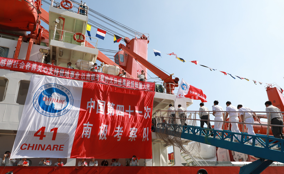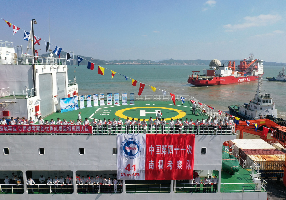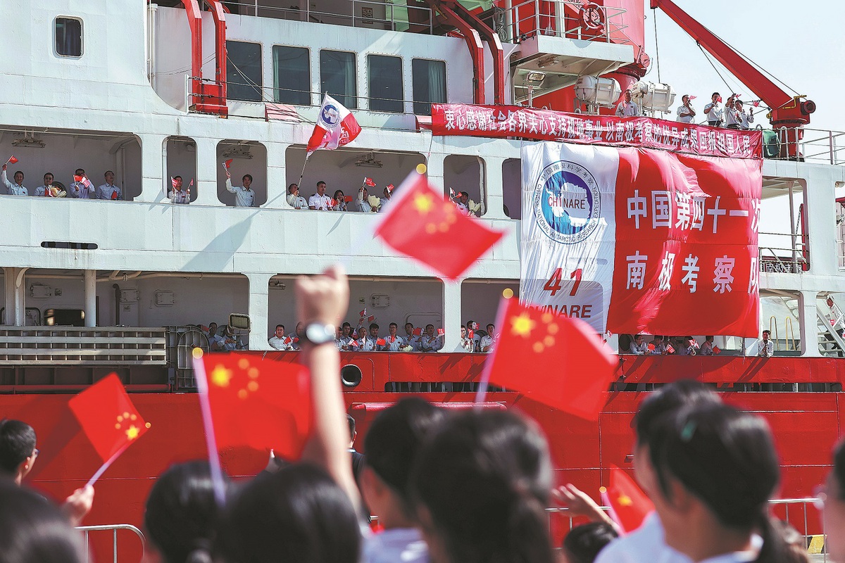 China's 41st Antarctic expedition team, gathered aboard the country's two polar icebreakers Xuelong and Xuelong 2, or Snow Dragon and Snow Dragon 2, set sail from Guangzhou, Guangdong province, on Friday headed south to conduct scientific investigations in the polar region for seven months.