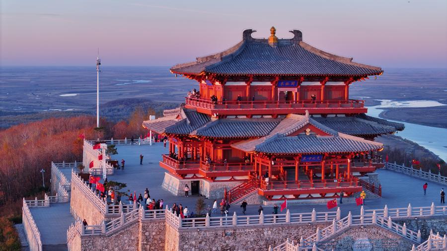 A drone photo shows tourists enjoying the sunrise scenery in Fuyuan City, northeast China's Heilongjiang Province, Oct. 12, 2024. (Photo by Yang Wei/Xinhua)