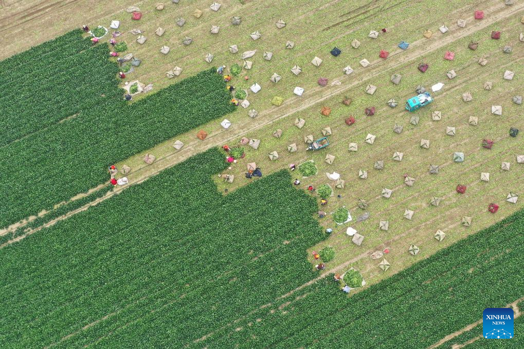 An aerial drone photo taken on Nov. 2, 2024 shows farmers harvesting spinach in Jiangzhuang Town of Gaomi, east China's Shandong Province. (Photo by Li Haitao/Xinhua)