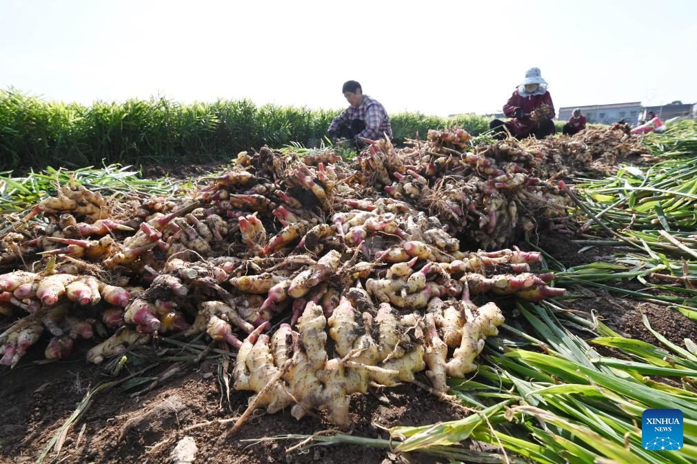 Farmers harvest ginger in Mazhuang Village of Shanwangzhuang Town in Qinyang, central China's Henan Province, Nov. 1, 2024. (Photo by Yang Fan/Xinhua)