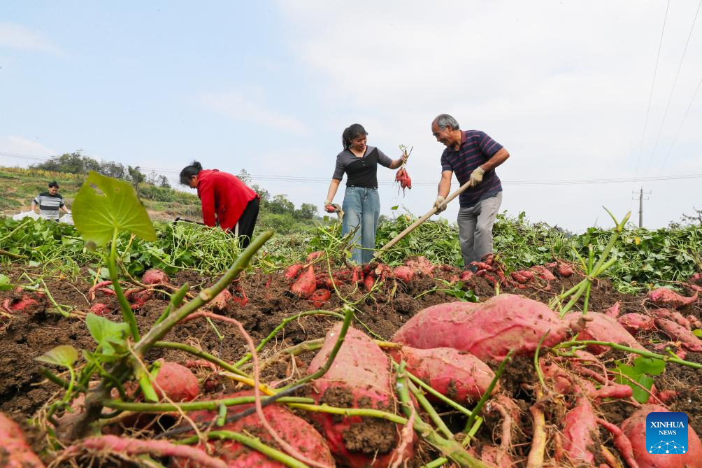 Farmers harvest sweet potatoes in Jiantou Town of Xintian County, central China's Hunan Province, Nov. 1, 2024. (Photo by Liu Guixiong/Xinhua)