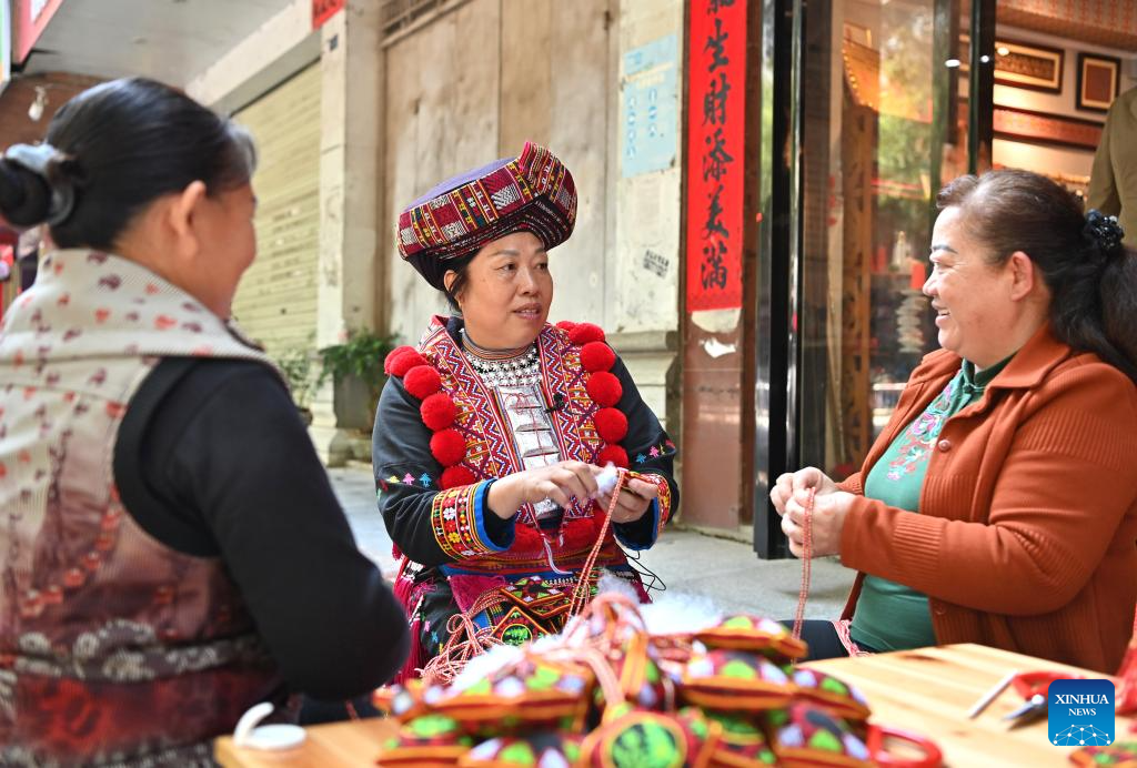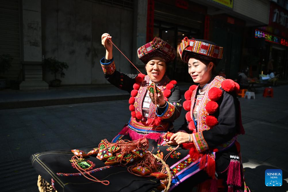Pan Haiyan (L) shows embroidery techniques to her apprentice in her workshop in Tianlin County, Baise City, south China's Guangxi Zhuang Autonomous Region, Oct. 31, 2024. (Xinhua/Zhou Hua)