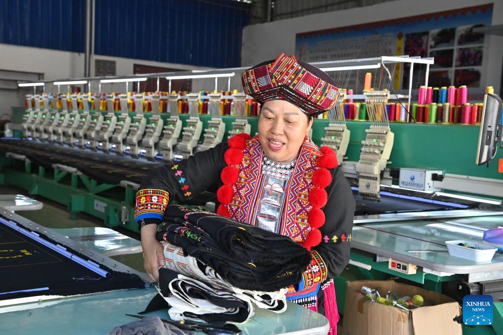 Pan Haiyan displays her embroidery work in her workshop in Tianlin County, Baise City, south China's Guangxi Zhuang Autonomous Region, Oct. 31, 2024. (Xinhua/Zhou Hua)