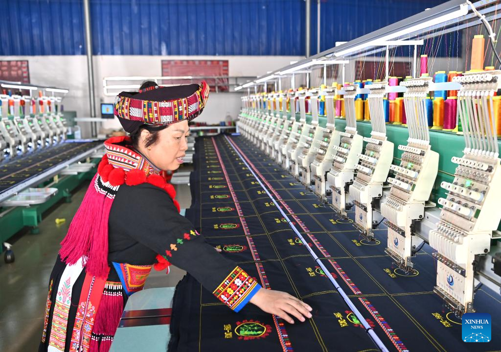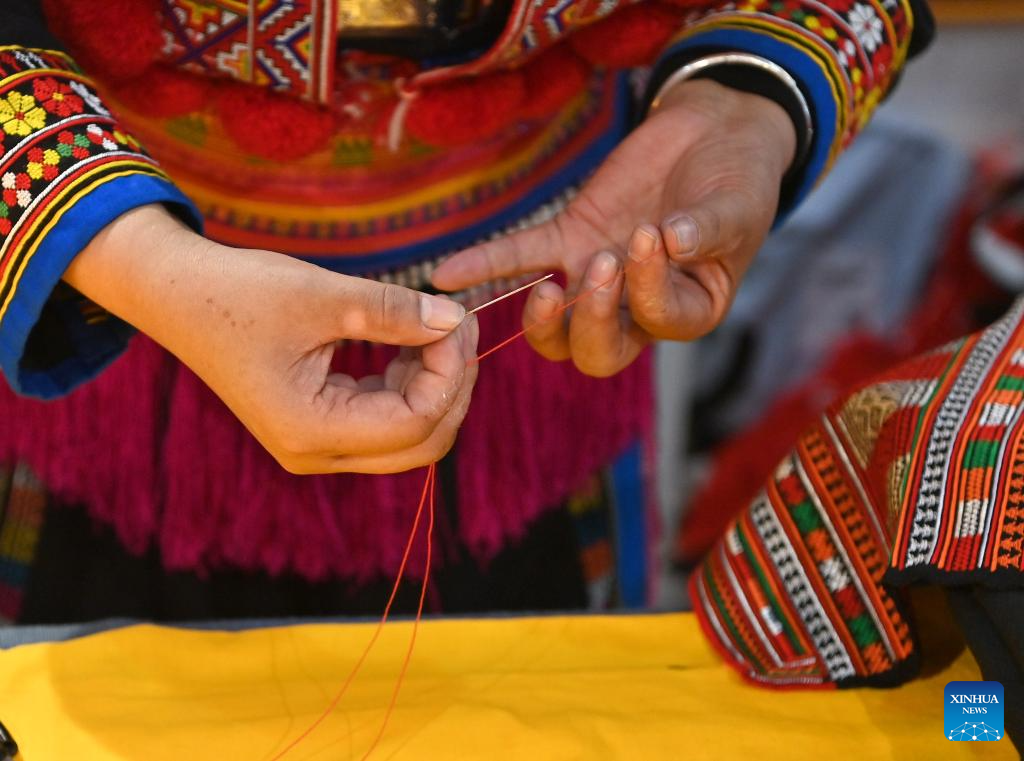 Pan Haiyan threads a needle in her embroidery workshop in Tianlin County, Baise City, south China's Guangxi Zhuang Autonomous Region, Oct. 31, 2024. (Xinhua/Zhou Hua)