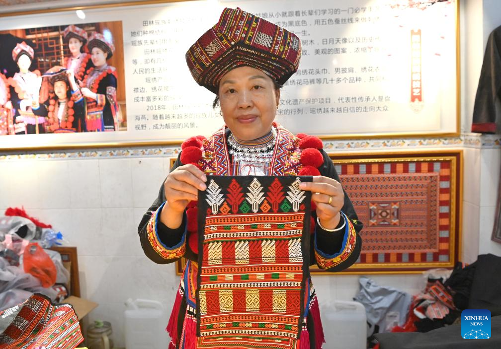 Boasts a long history, Tianlin Yao ethnic embroidery skill is known for exquisite patterns, with the themes of creation mainly based on life of the Yao people.