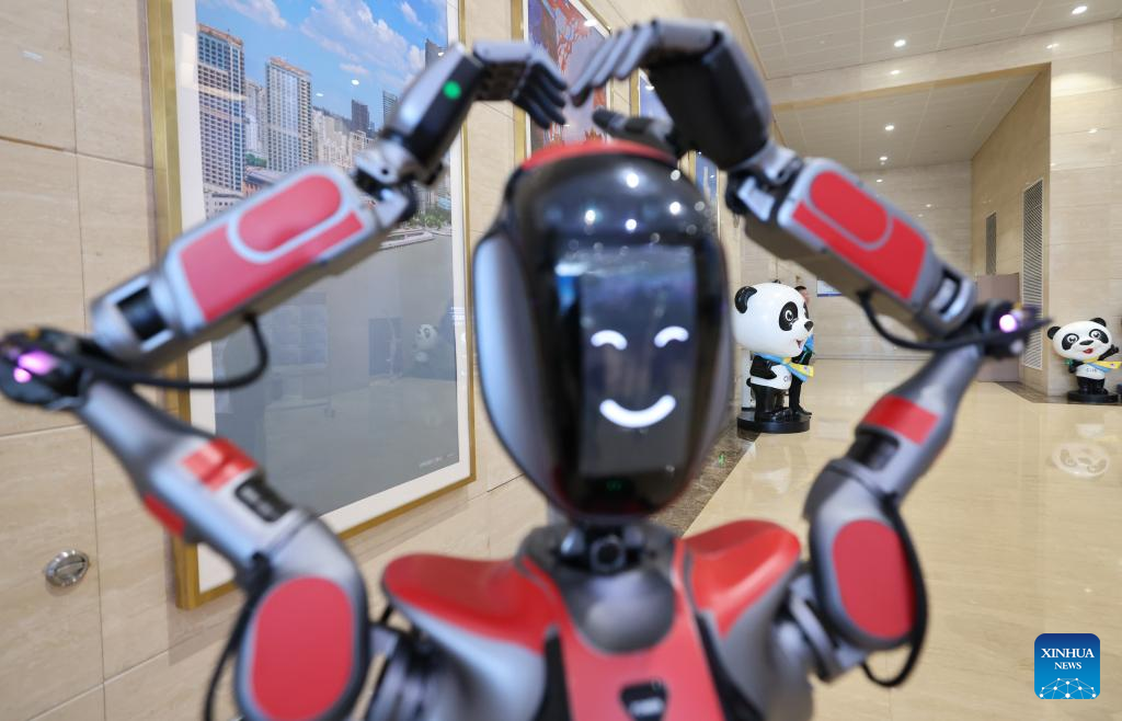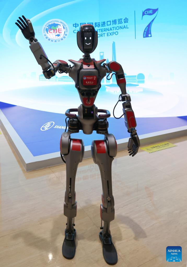 Xiaoxin, a humanoid robot providing inquiry service at the media center for the 7th China International Import Expo (CIIE), welcomes journalists at the National Exhibition and Convention Center (Shanghai) in Shanghai, east China, Nov. 4, 2024. (Xinhua/Yin Gang)