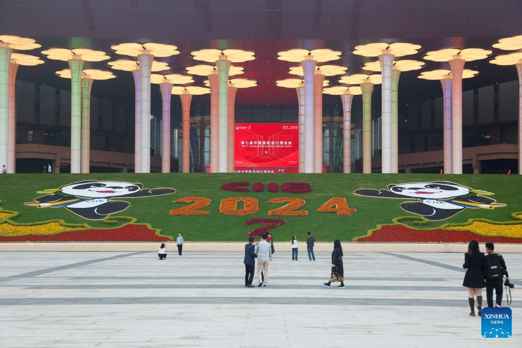 This photo taken on Nov. 4, 2024 shows the automobile exhibition area of the 7th China International Import Expo (CIIE) at the National Exhibition and Convention Center (Shanghai) in Shanghai, east China. The 7th CIIE will be held in Shanghai from Nov. 5 to 10. (Xinhua/Tang Rufeng)