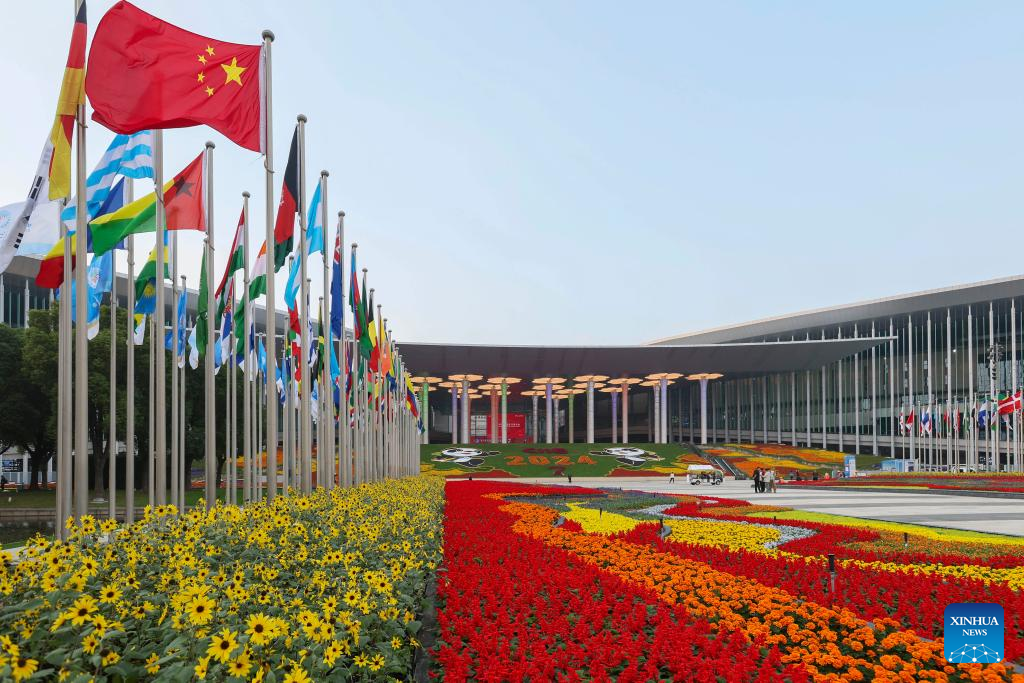 This photo shows a view of the National Exhibition and Convention Center (Shanghai), the main venue for the 7th China International Import Expo (CIIE), in east China's Shanghai, Nov. 4, 2024. The 7th CIIE will be held in Shanghai from Nov. 5 to 10. (Xinhua/Wang Xiang)