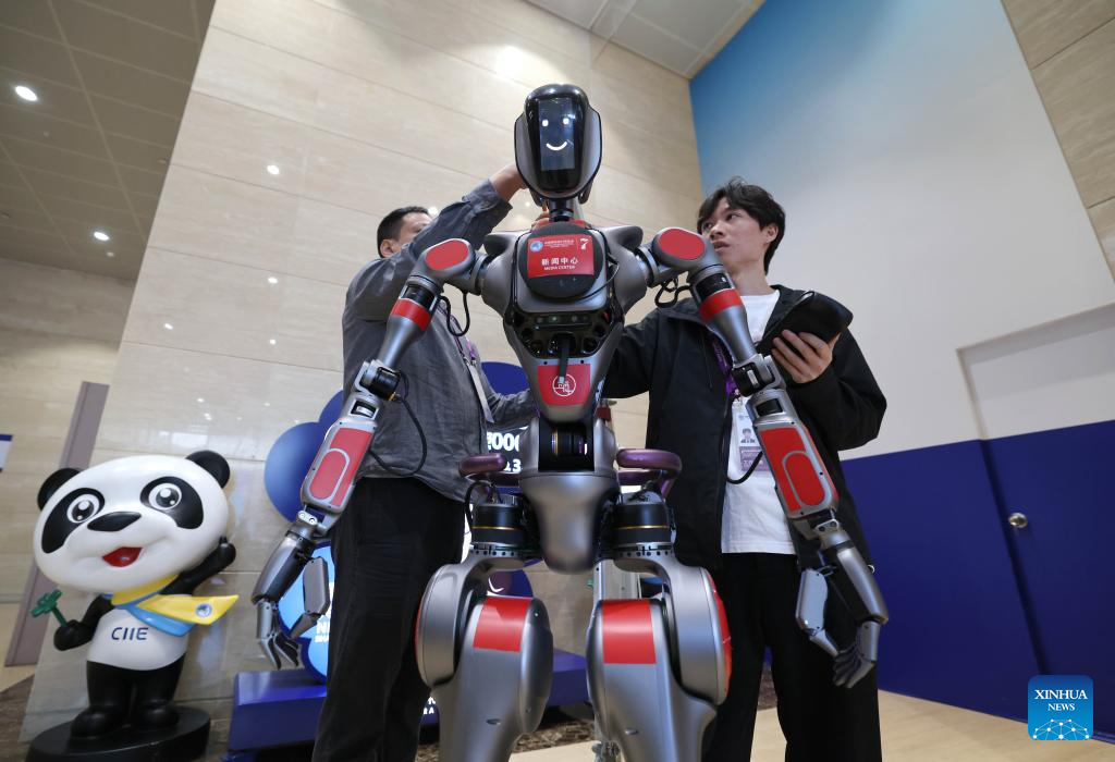 Staff members debug Xiaoxin, a humanoid robot providing inquiry service at the media center for the 7th China International Import Expo (CIIE), at the National Exhibition and Convention Center (Shanghai) in Shanghai, east China, Nov. 4, 2024. (Xinhua/Yin Gang)