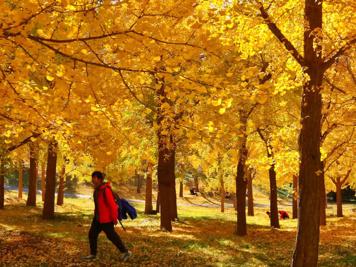 A tourist strolls through the gingko forest at the China National Botanical Garden (North Garden) in Beijing, capital of China, Nov 3, 2024. (Photo by Jiang Dong/chinadaily.com.cn)