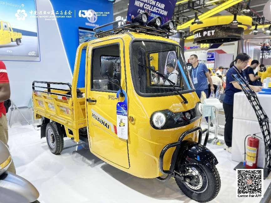A passenger electric tricycle exhibited by Huaihai Holding Group attracts extensive attention at the 136th Canton Fair held in Guangzhou, south China's Guangdong Province. (Photo/Canton Fair)