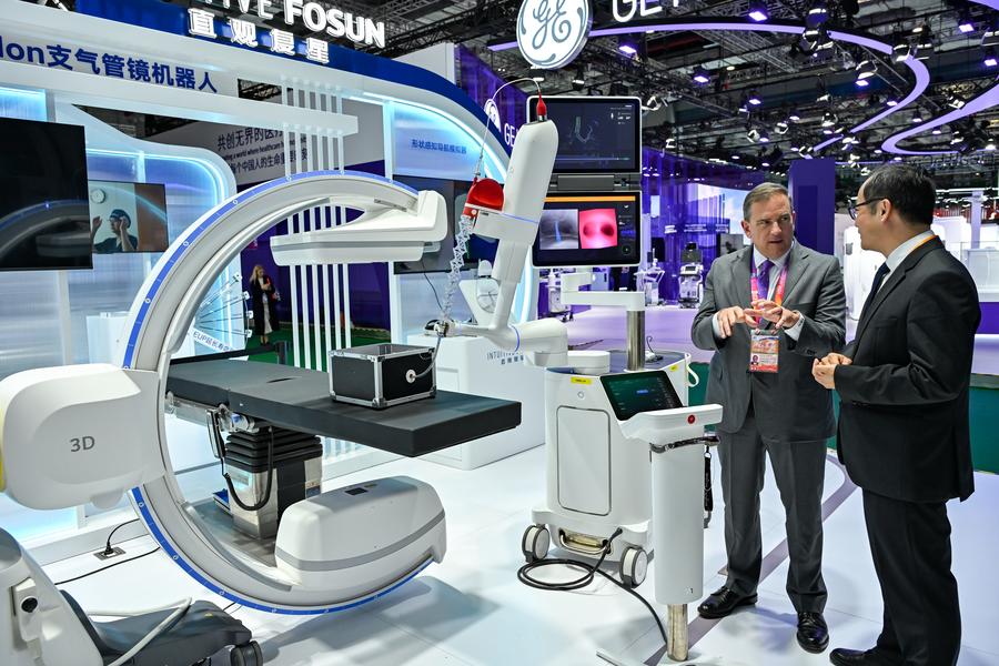 A visitor learns about a bronchoscope robot at the exhibition area of Intuitive Fosun during the seventh China International Import Expo (CIIE) in east China's Shanghai, Nov. 5, 2024. (Xinhua/Zhang Cheng)