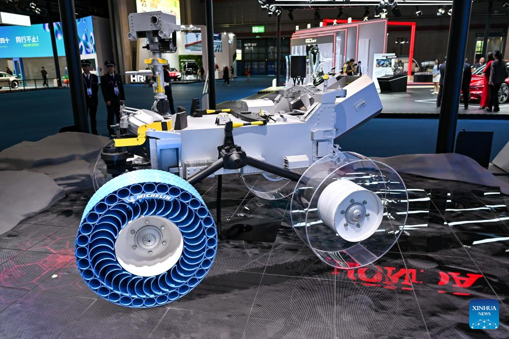 This photo taken on Nov. 5, 2024 shows the tire of lunar rover at the exhibition area of Michelin during the seventh China International Import Expo (CIIE) in east China's Shanghai. The newest edition of the CIIE, the world's first national-level exposition dedicated to imports, opened on Tuesday in Shanghai. (Xinhua/Zhang Cheng)