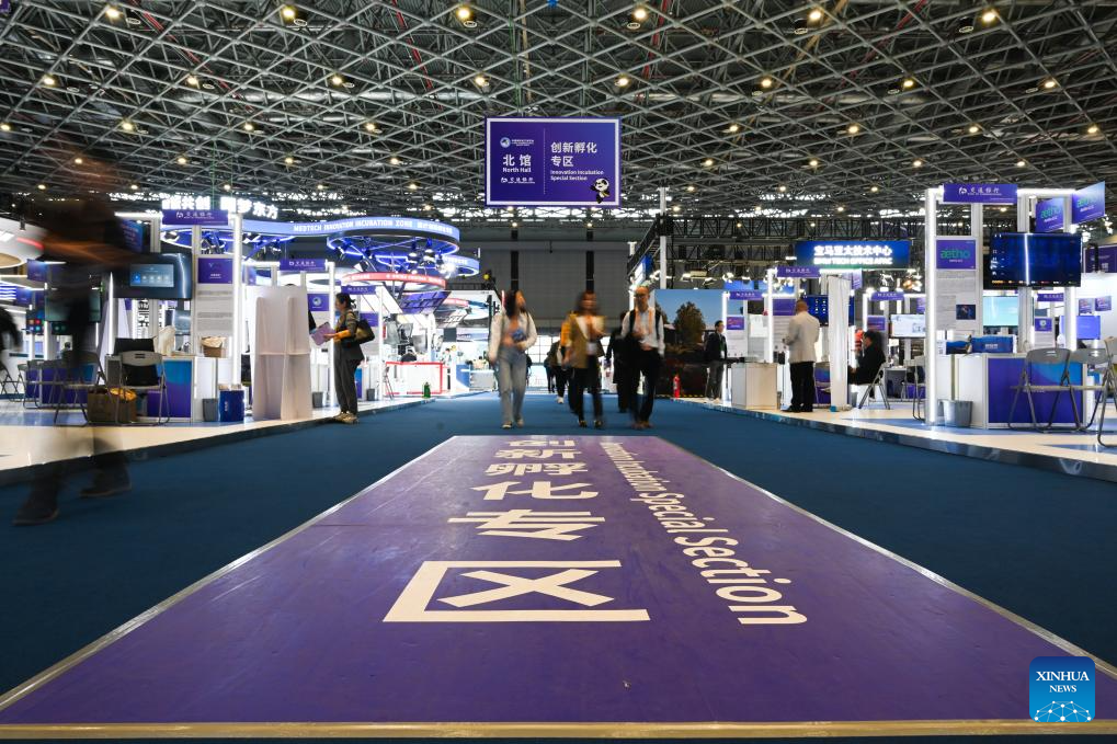 People visit the Innovation Incubation Special Section during the seventh China International Import Expo (CIIE) in east China's Shanghai, Nov. 5, 2024. The newest edition of the CIIE, the world's first national-level exposition dedicated to imports, opened on Tuesday in Shanghai. (Xinhua/Zhang Keren)