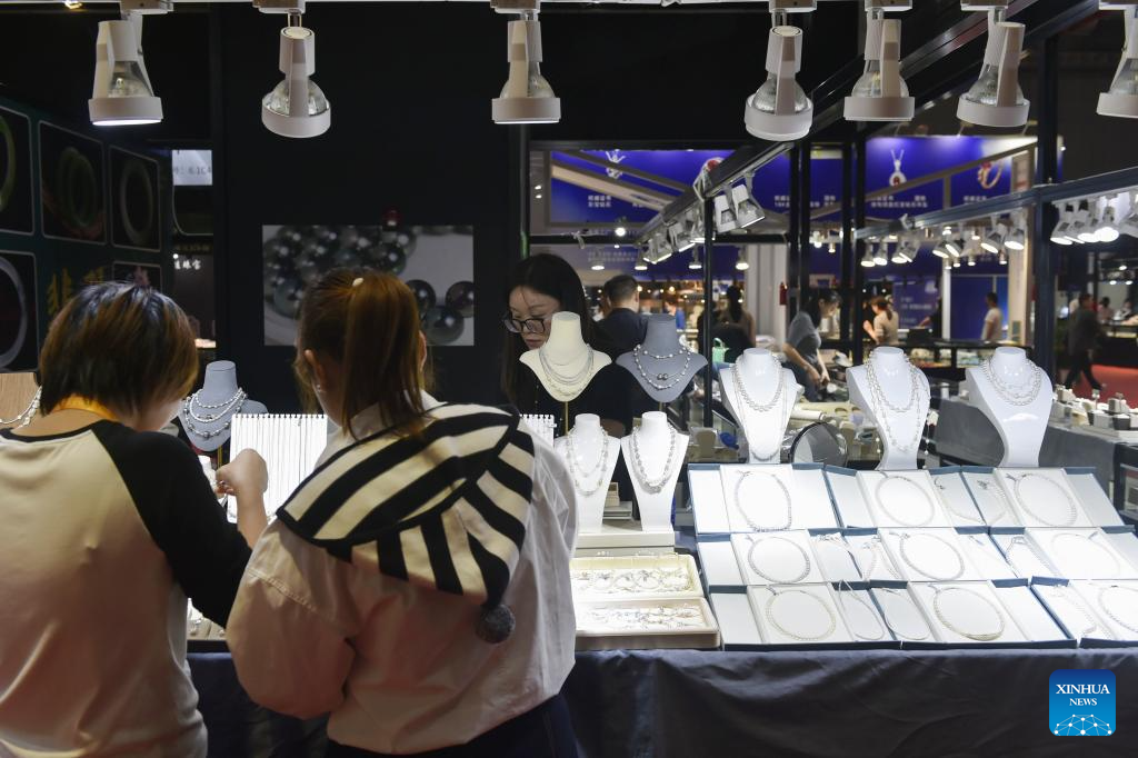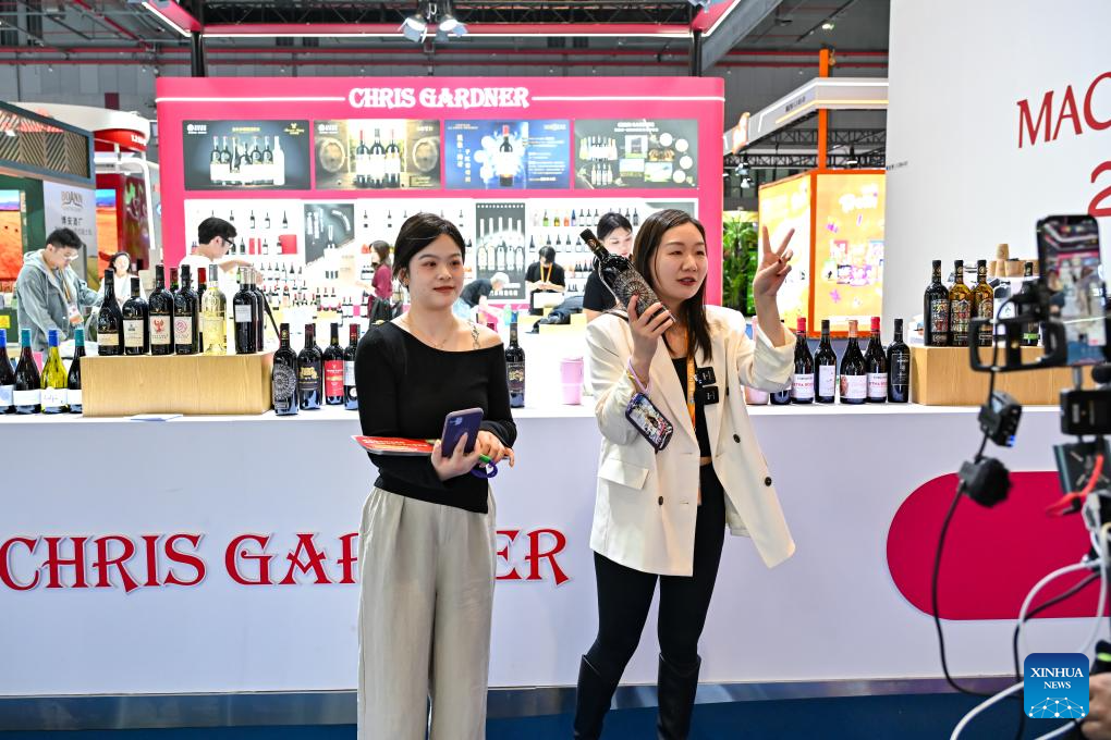 Staff members promote products via livestreaming at the booth of Chris Gardner during the seventh China International Import Expo (CIIE) in east China's Shanghai, Nov. 5, 2024. The newest edition of the CIIE, the world's first national-level exposition dedicated to imports, opened on Tuesday in Shanghai. (Xinhua/Zhang Cheng)