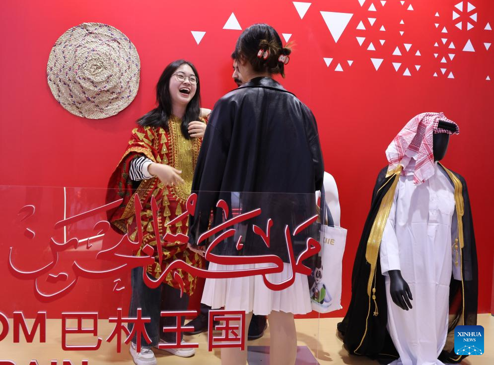 A visitor tries on traditional Bahraini costume at the Bahrain Pavilion during the seventh China International Import Expo (CIIE) in east China's Shanghai, Nov. 5, 2024. The newest edition of the CIIE, the world's first national-level exposition dedicated to imports, opened on Tuesday in Shanghai. (Xinhua/Yin Gang)