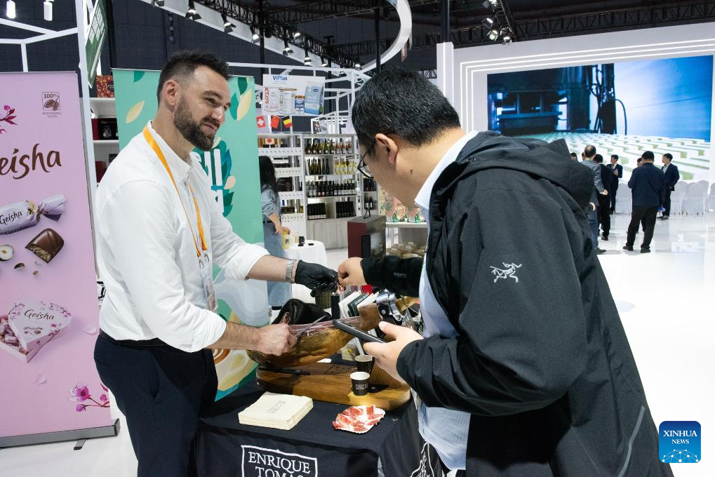 An exhibitor introduces Spanish ham to a visitor during the seventh China International Import Expo (CIIE) in east China's Shanghai, Nov. 5, 2024. The newest edition of the CIIE, the world's first national-level exposition dedicated to imports, opened on Tuesday in Shanghai. (Xinhua/Liu Qian)