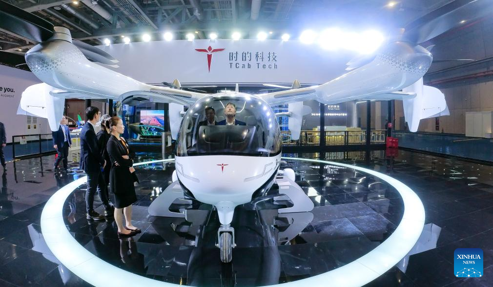 Visitors experience an electric vertical takeoff and landing (eVTOL) aircraft at the exhibition area of Automobile during the seventh China International Import Expo (CIIE) in east China's Shanghai, Nov. 5, 2024. The newest edition of the CIIE, the world's first national-level exposition dedicated to imports, opened on Tuesday in Shanghai. (Xinhua/Zhang Cheng)