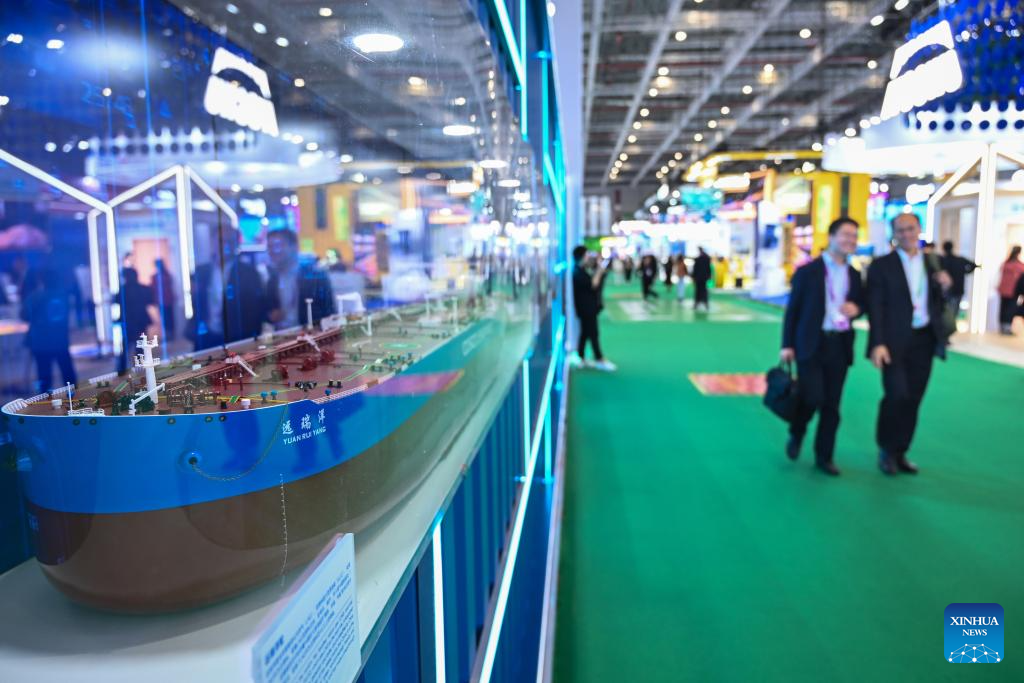 People visit the exhibition area of trade in services during the seventh China International Import Expo (CIIE) in east China's Shanghai, Nov. 5, 2024. The newest edition of the CIIE, the world's first national-level exposition dedicated to imports, opened on Tuesday in Shanghai. (Xinhua/Zhang Keren)