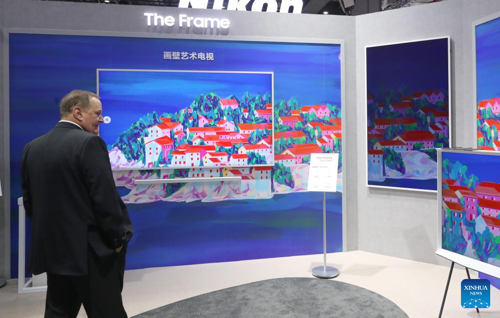 A visitor looks at TV sets of Samsung at the exhibition area of Intelligent Industry and Information Technology during the seventh China International Import Expo (CIIE) in east China's Shanghai, Nov. 5, 2024. The newest edition of the CIIE, the world's first national-level exposition dedicated to imports, opened on Tuesday in Shanghai. (Xinhua/Fang Zhe)
