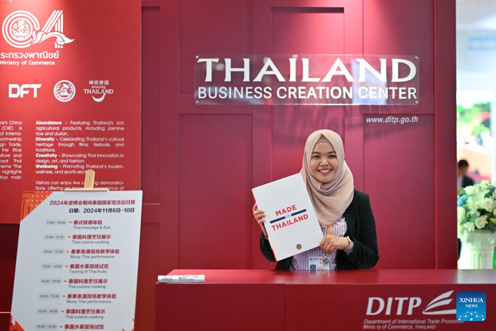 A worker poses for photos at the Thailand Pavilion during the seventh China International Import Expo (CIIE) in east China's Shanghai, Nov. 5, 2024. The newest edition of the CIIE, the world's first national-level exposition dedicated to imports, opened on Tuesday in Shanghai. (Xinhua/Xin Yuewei)