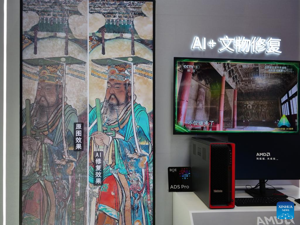 An illustration of cultural relic restoration using AI technology is on display at the booth of AMD during the seventh China International Import Expo (CIIE) in east China's Shanghai, Nov. 5, 2024. The newest edition of the CIIE, the world's first national-level exposition dedicated to imports, opened on Tuesday in Shanghai. (Xinhua/Wang Yiliang)