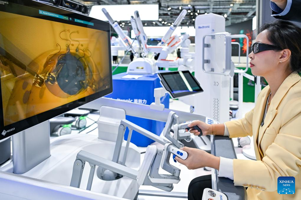A visitor operates a surgical robot at the exhibition area of Medical Equipment and Healthcare Products during the seventh China International Import Expo (CIIE) in east China's Shanghai, Nov. 5, 2024. The newest edition of the CIIE, the world's first national-level exposition dedicated to imports, opened on Tuesday in Shanghai. (Xinhua/Zhang Cheng)