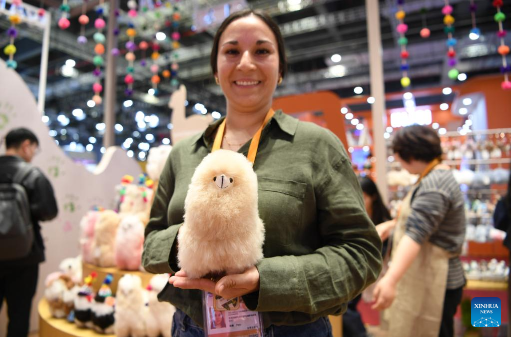 An exhibitor shows an alpaca stuffed toy at the booth of Warmpaca during the seventh China International Import Expo (CIIE) in east China's Shanghai, Nov. 5, 2024. The newest edition of the CIIE, the world's first national-level exposition dedicated to imports, opened on Tuesday in Shanghai. (Xinhua/Jin Mamengni)
