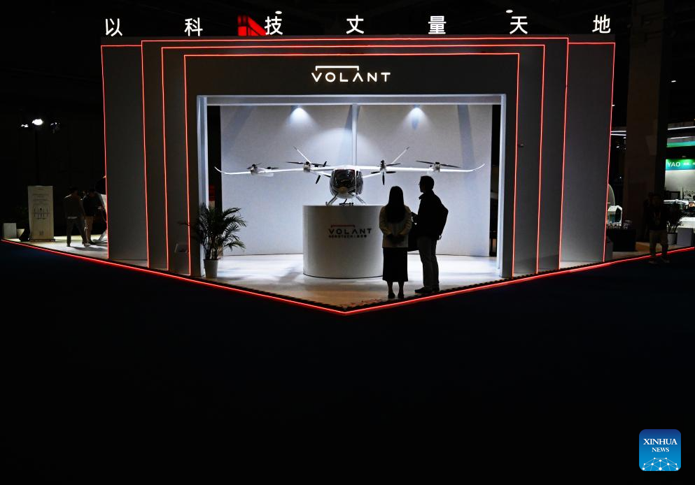 People look at a model of an electric vertical takeoff and landing aircraft during the seventh China International Import Expo (CIIE) in east China's Shanghai, Nov. 5, 2024. The newest edition of the CIIE, the world's first national-level exposition dedicated to imports, opened on Tuesday in Shanghai. (Xinhua/Zhang Keren)