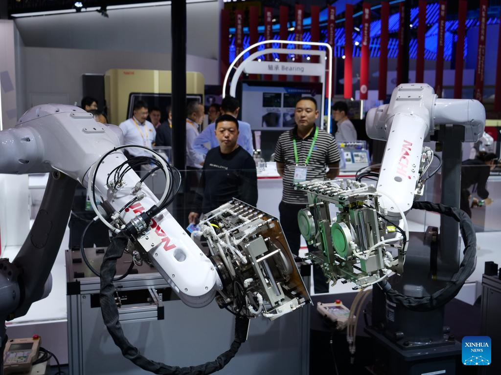 People look at robots at the exhibition area of Nachi-Fujikoshi Corp. during the seventh China International Import Expo (CIIE) in east China's Shanghai, Nov. 5, 2024. The newest edition of the CIIE, the world's first national-level exposition dedicated to imports, opened on Tuesday in Shanghai. (Xinhua/Wang Yiliang)
