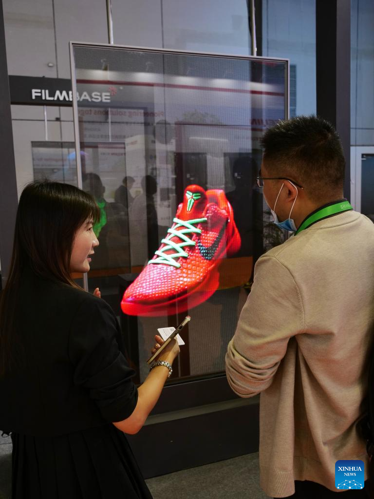 A visitor looks at a transparent display during the seventh China International Import Expo (CIIE) in east China's Shanghai, Nov. 5, 2024. The newest edition of the CIIE, the world's first national-level exposition dedicated to imports, opened on Tuesday in Shanghai. (Xinhua/Wang Yiliang)