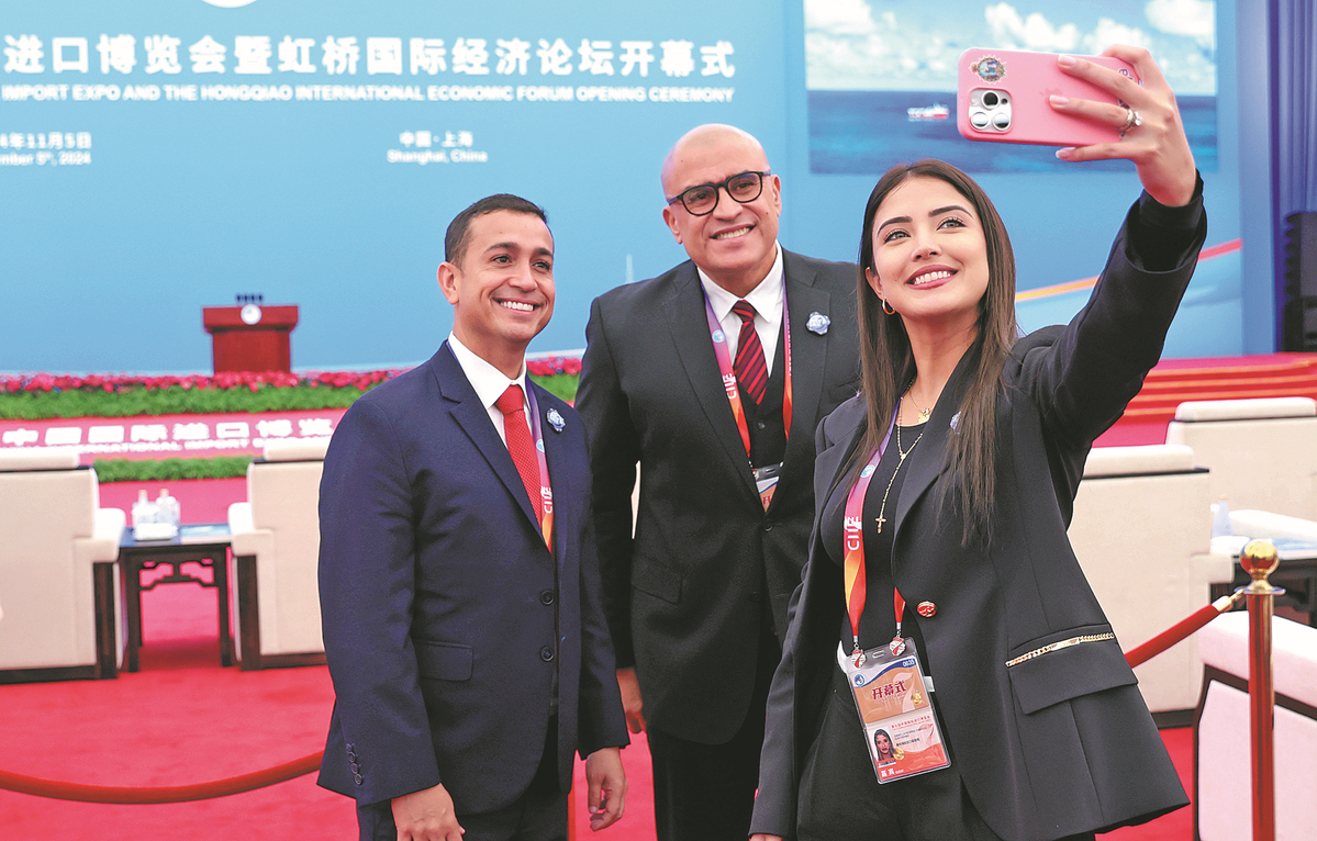 Guests at the seventh China International Import Expo take a selfie before the opening ceremony of the event in Shanghai on Tuesday. The expo runs through Sunday. (ZOU HONG/CHINA DAILY)