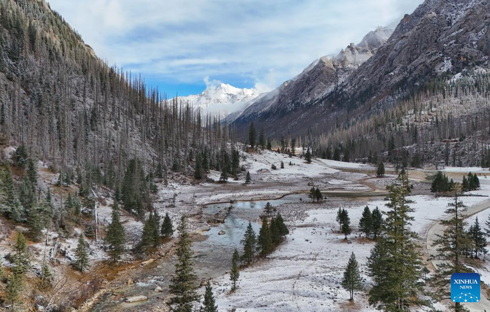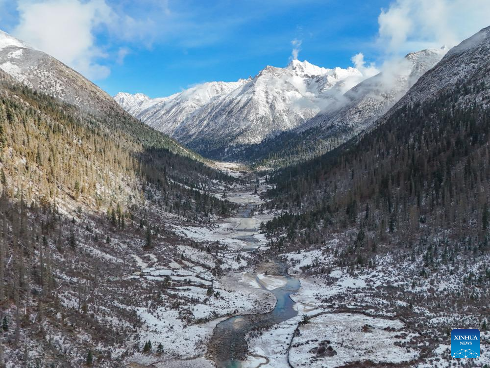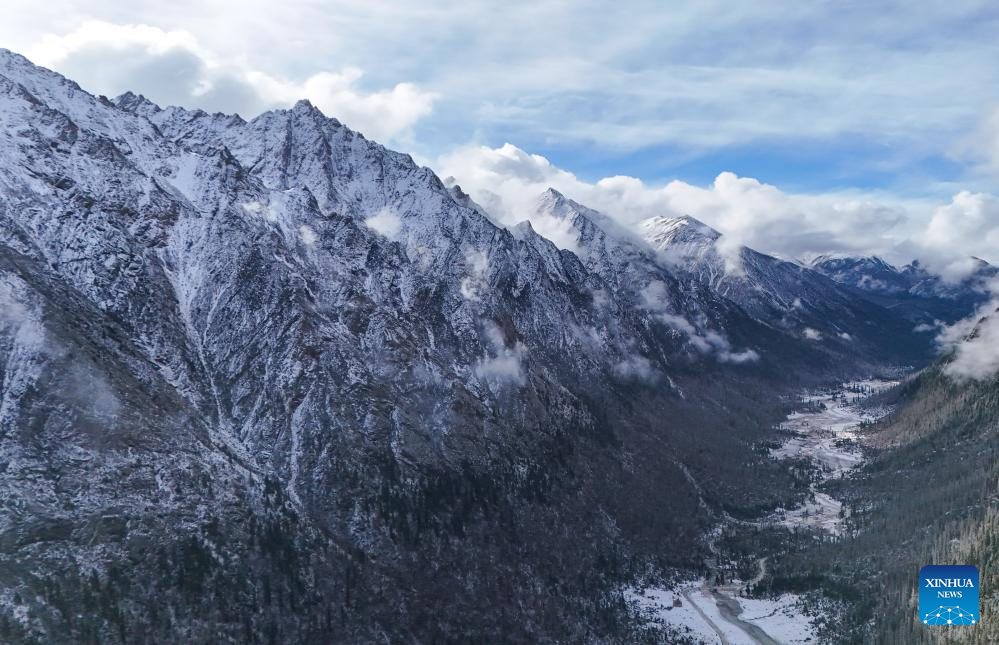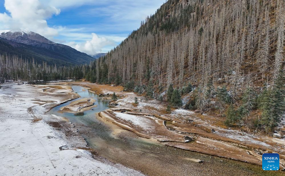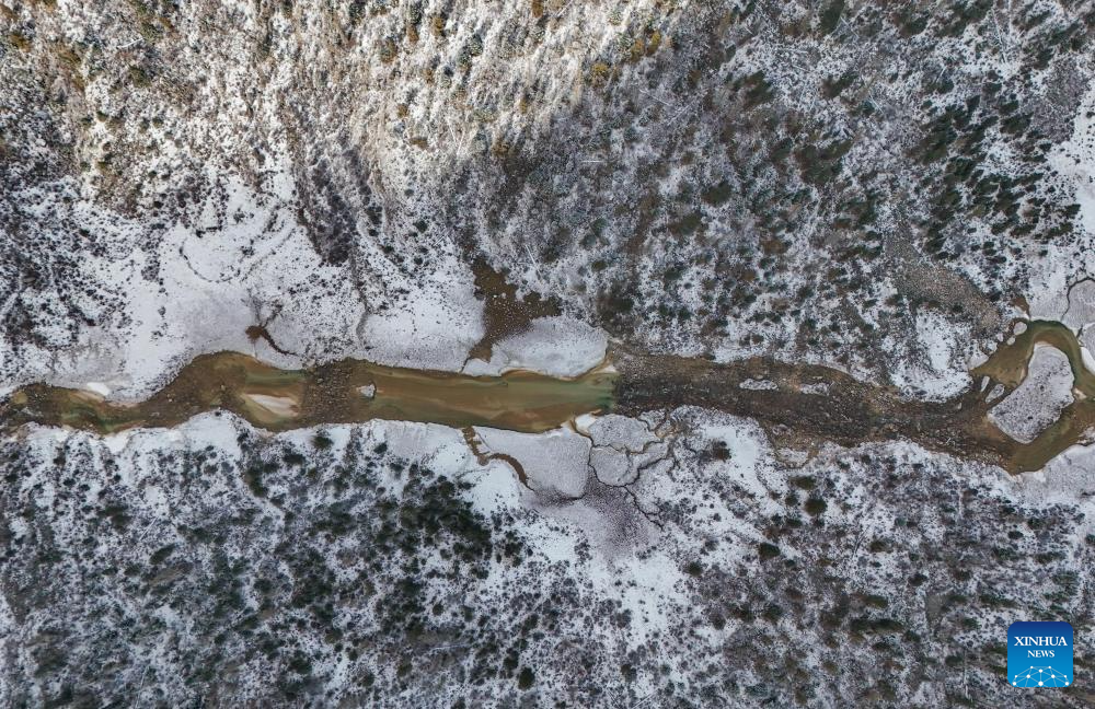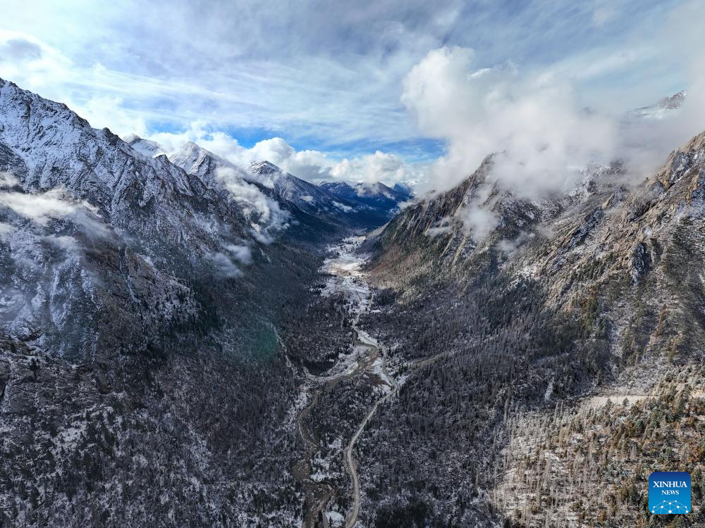 A drone photo taken on Nov. 4, 2024 shows the scenery of Duopugou scenic spot in Dege County of Garze Tibetan Autonomous Prefecture, southwest China's Sichuan Province. The Duopugou scenic spot boasts a picturesque scenery and abundant reserve of animals and plants. (Xinhua/Wang Xi)