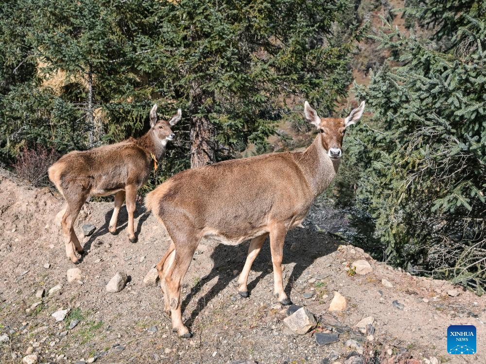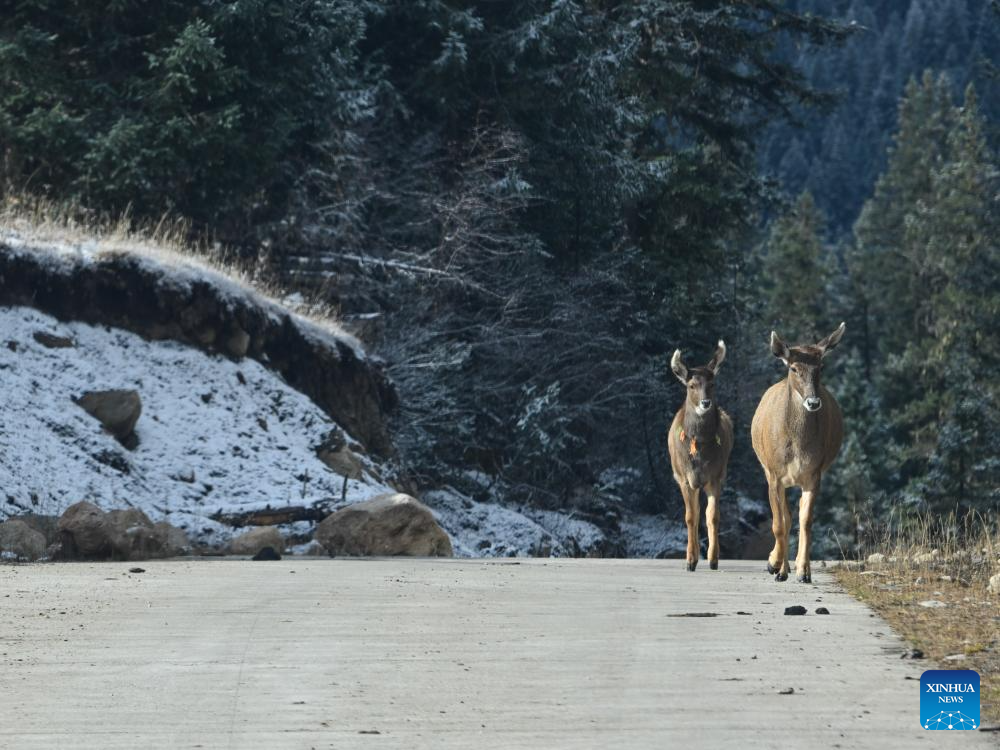 Two white-lipped deer are pictured in Duopugou scenic spot in Dege County of Garze Tibetan Autonomous Prefecture, southwest China's Sichuan Province, Nov. 4, 2024. The Duopugou scenic spot boasts a picturesque scenery and abundant reserve of animals and plants. (Xinhua/Wang Xi)