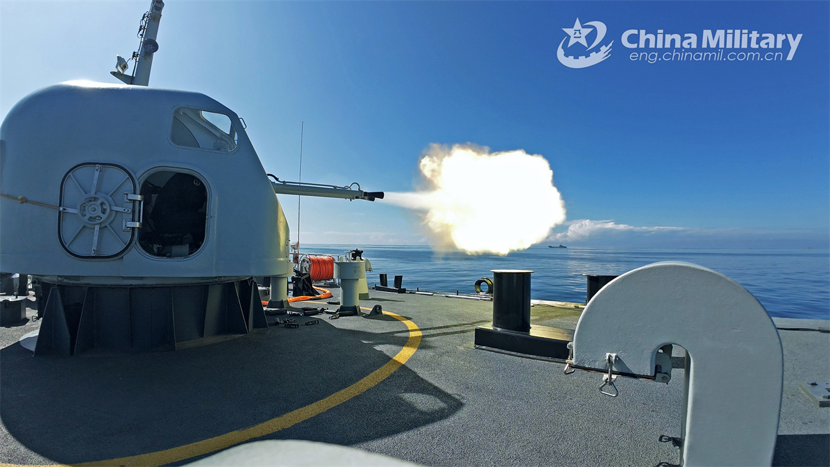 A landing ship attached to a Chinese PLA Navy's flotilla fires its main gun during a maritime exercise in the South China Sea on September 14, 2024. (eng.chinamil.com.cn/Photo by Wang Wenbin)