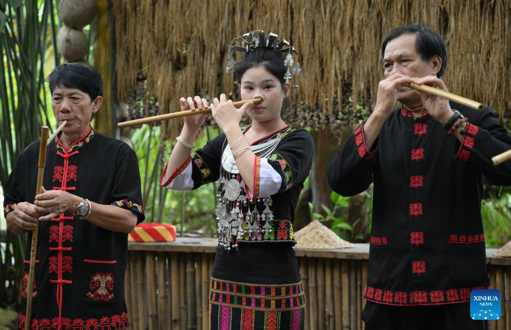 Musicians perform traditional musical instruments made of bamboo at Binglanggu tourism area in Baoting Li and Miao Autonomous County, south China's Hainan Province, Nov. 4, 2024. Binglanggu tourism area nestled in a tropical rainforest has being dedicated for years to promoting the culture of Li, an ethnic minority group native to this island province. (Xinhua/Pu Xiaoxu)