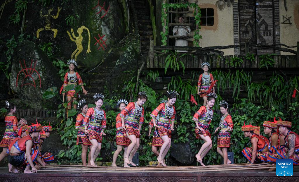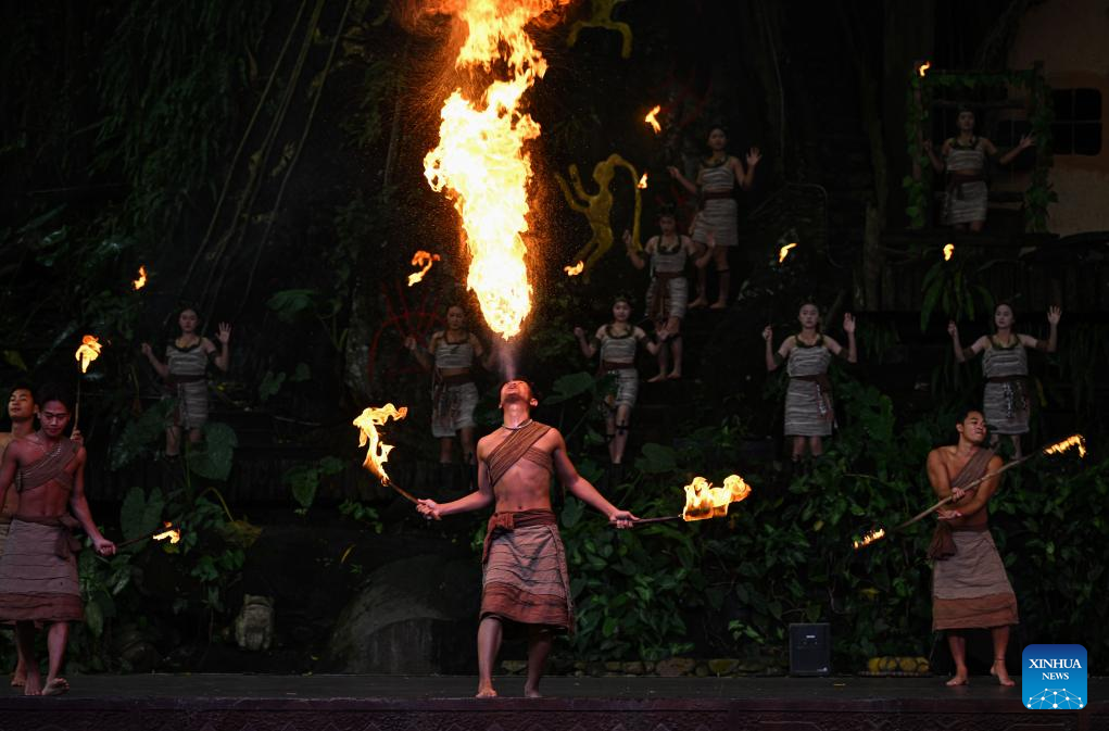 Actors perform at Binglanggu tourism area in Baoting Li and Miao Autonomous County, south China's Hainan Province, Nov. 4, 2024. Binglanggu tourism area nestled in a tropical rainforest has being dedicated for years to promoting the culture of Li, an ethnic minority group native to this island province. (Xinhua/Pu Xiaoxu)