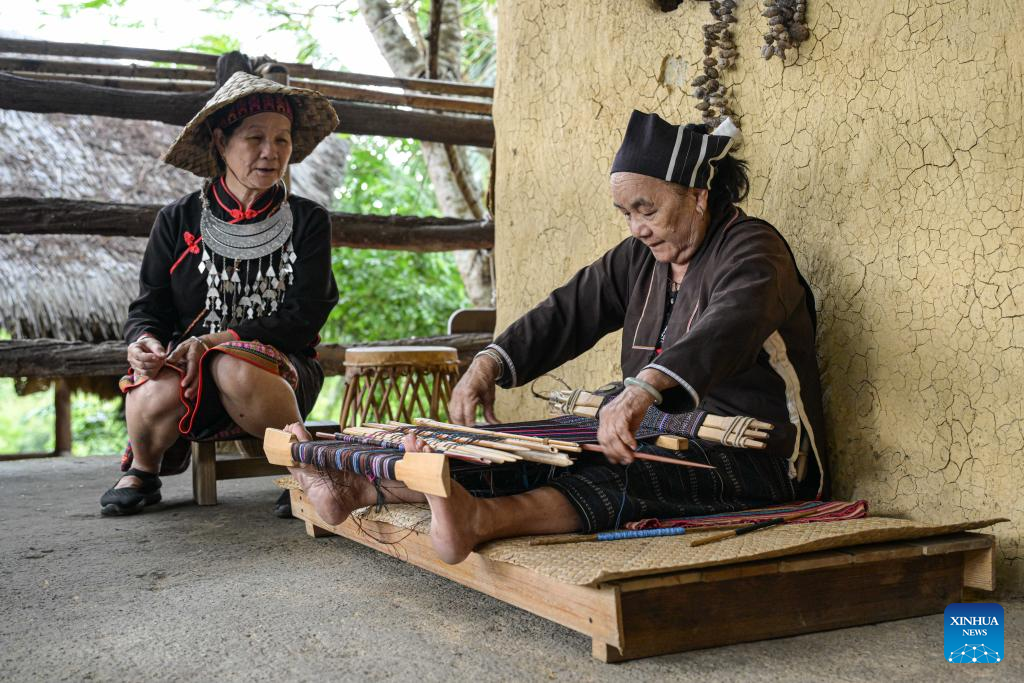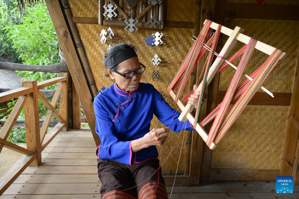 A senior Li woman demonstrates a traditional weaving technique at Binglanggu tourism area in Baoting Li and Miao Autonomous County, south China's Hainan Province, Nov. 4, 2024. Binglanggu tourism area nestled in a tropical rainforest has being dedicated for years to promoting the culture of Li, an ethnic minority group native to this island province. (Xinhua/Pu Xiaoxu)