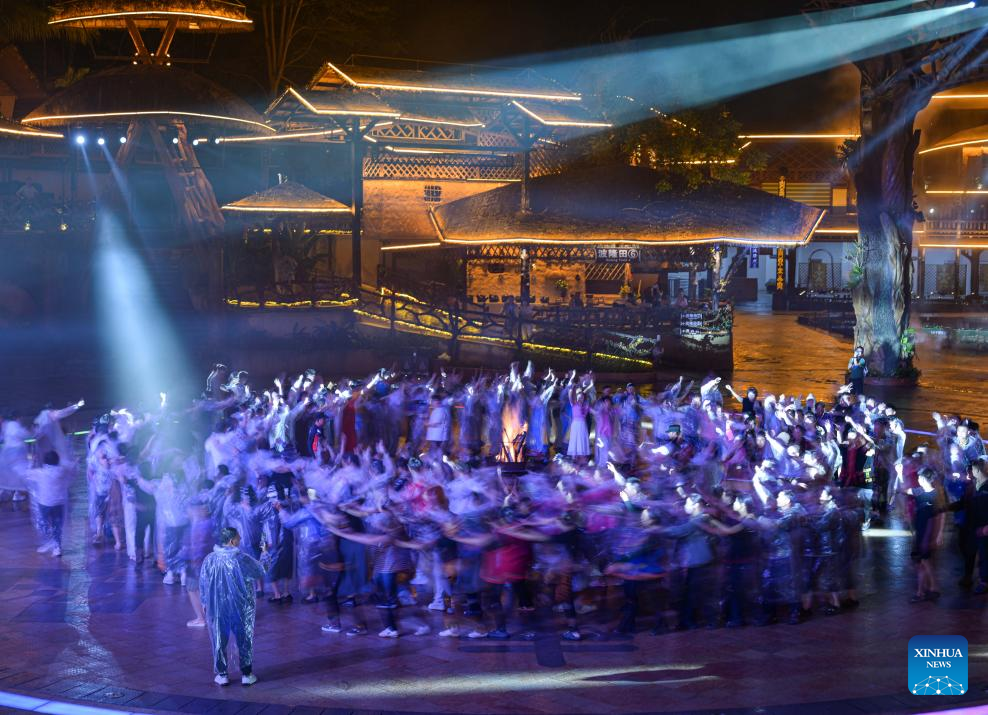 Tourists join in a group dance at Binglanggu tourism area in Baoting Li and Miao Autonomous County, south China's Hainan Province, Nov. 4, 2024. Binglanggu tourism area nestled in a tropical rainforest has being dedicated for years to promoting the culture of Li, an ethnic minority group native to this island province. (Xinhua/Pu Xiaoxu)