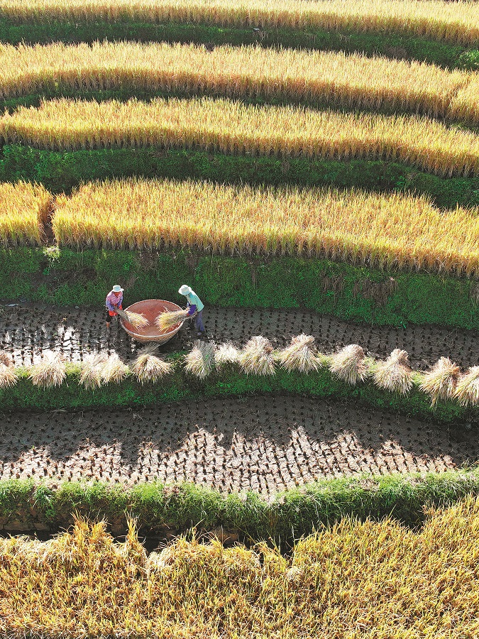 Villagers harvest rice in Tengchong, Yunnan province, on Oct 27. (GONG ZUJIN/XINHUA)