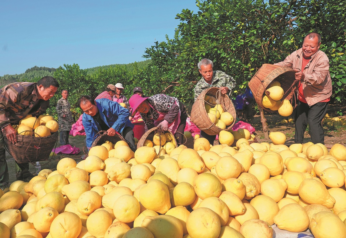 Farmers gather freshly harvested pomelos in Rongshui, a county in Guangxi Zhuang autonomous region, on Nov 2, 2024. (LONG TAO/XINHUA)