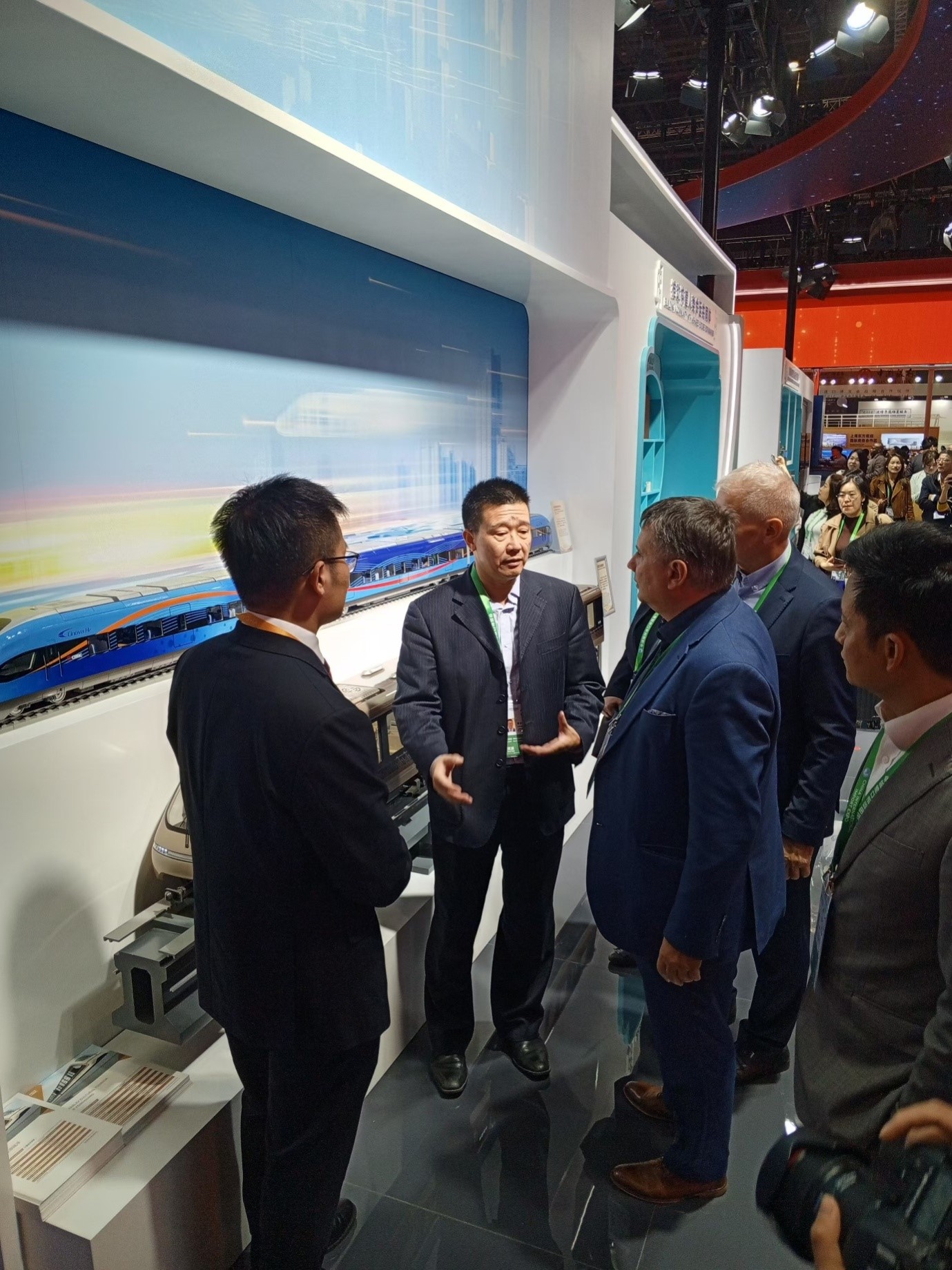 Staff members speak with attendees about the Chinese railway sector in the Chinese national pavilion at the 7th China International Import Expo (CIIE) on Nov. 6, 2024, east China's Shanghai. (People's Daily Online/Kostas Papathanasiou)