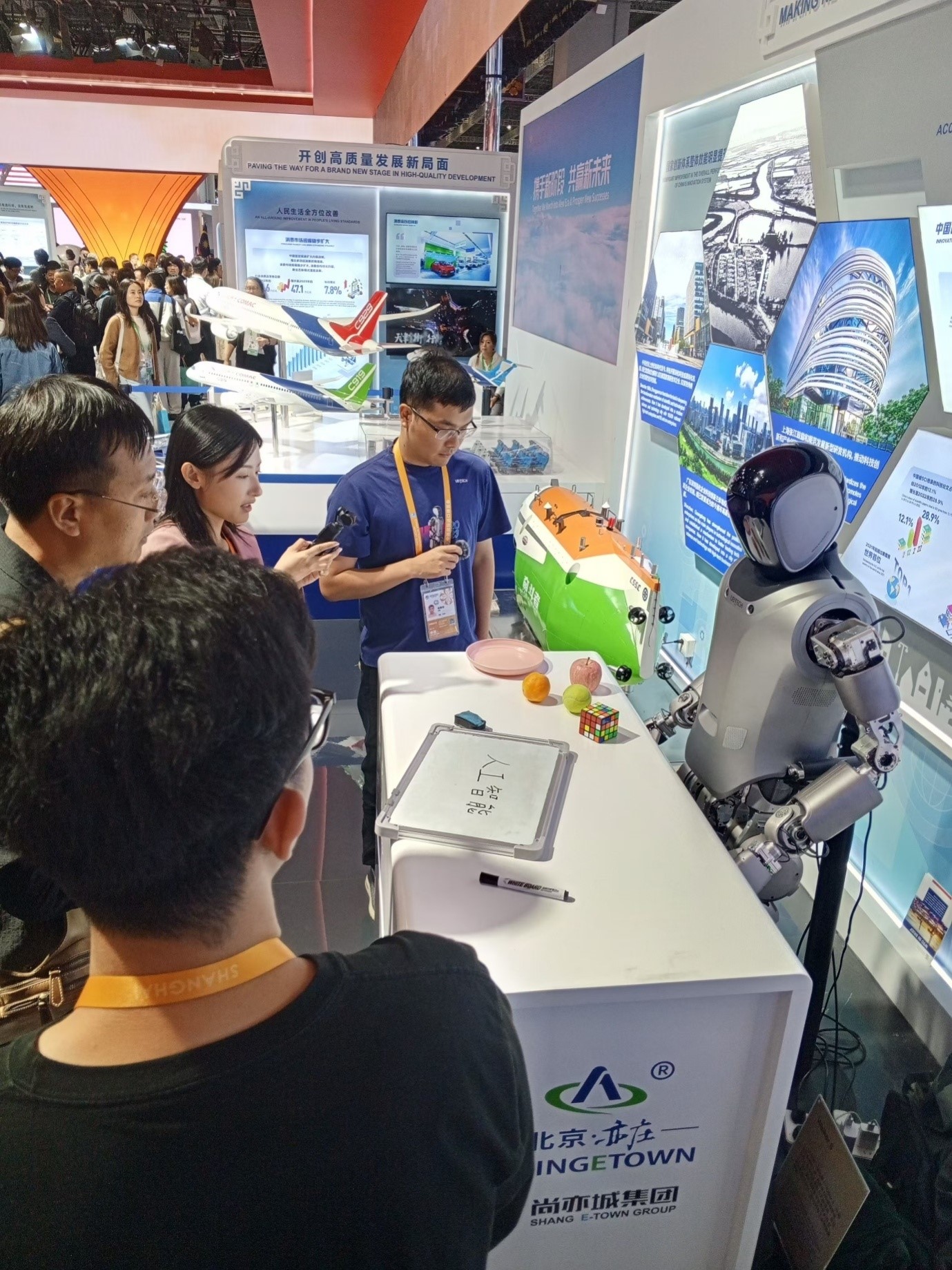An attendee writes a Chinese phrase for the robot to read in the Chinese national pavilion at the 7th China International Import Expo (CIIE) on Nov. 6, 2024, east China's Shanghai. (People's Daily Online/Kostas Papathanasiou)