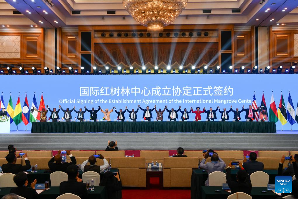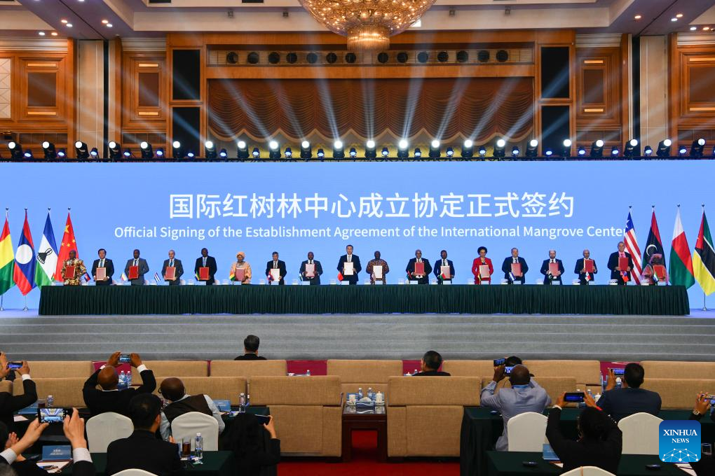 Delegates attend a signing ceremony of an agreement on the establishment of the International Mangrove Center (IMC) in Shenzhen, south China's Guangdong Province, Nov. 6, 2024. (Xinhua/Liang Xu)