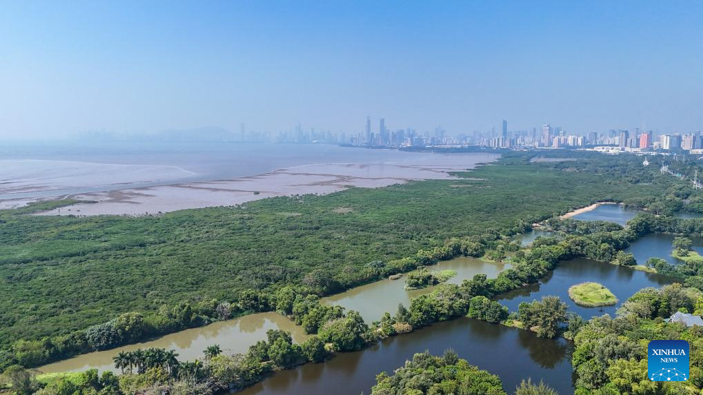 An aerial drone photo shows a view of a mangrove wetland in Futian of Shenzhen, south China's Guangdong Province, Nov. 6, 2024. (Xinhua/Liang Xu)